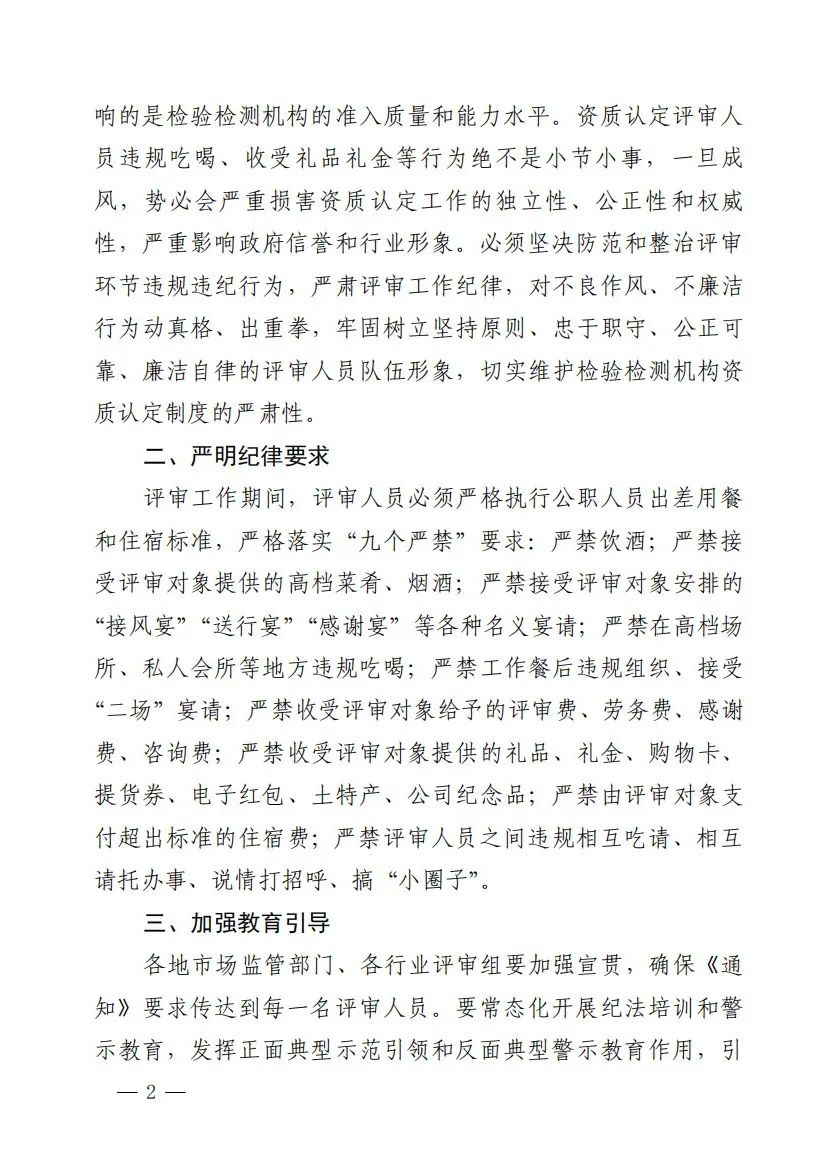 检验检测机构资质认定评审工作纪律迎来最严要求!近日,国家认证认可监督管理委员会(国家认监委)正式发布《关于进一步严肃检验检测机构资质认定评审工作纪律的通知》(国认监函[2025]6号),剑指评审环节的违规违纪行为,明确划出“九个严禁”的红线,旨在构建公正、权威、高效、廉洁的评审秩序。这对规范行业准入、提升评审公信力意义重大,各相关机构及人员务必高度重视!