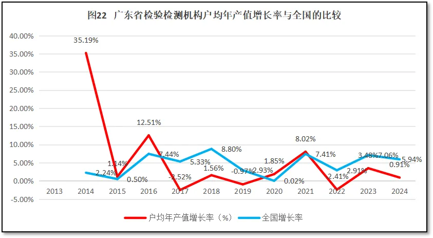 再来看广东省检验检测机构人均年产值增长率与全国人均年产值增长率的比较,如图19所示。